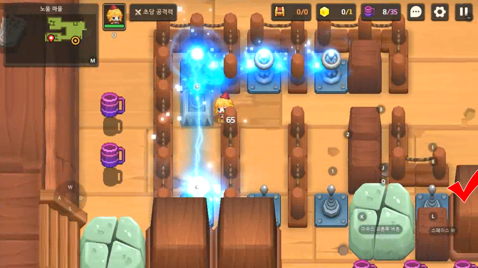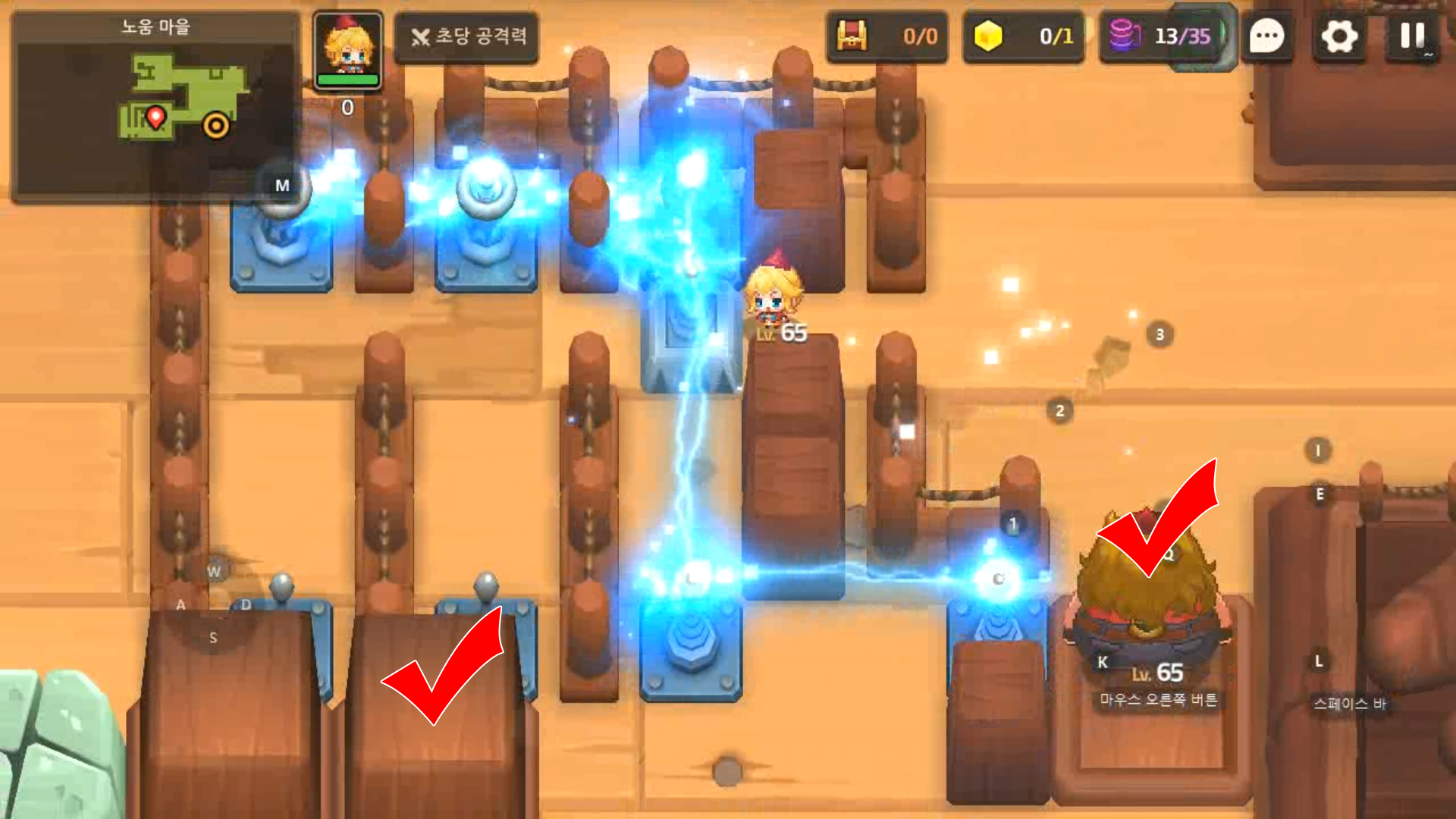 그다음 뚱보 노움으로 오른쪽 기둥이 안 올라오게 하고 리셋 후 위에 사진처럼 배치합니다. 그러면 가운데 표시한 기둥이 내려갑니다.
