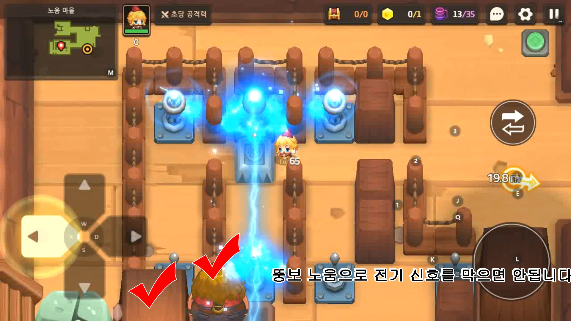 그리고 가운데 기둥이 내려가면 뚱보 노움으로 올라오지 못하게 사진의 위치에 놓습니다 다시 리셋 후 위에 사진처럼 배치하면 됩니다. 이때 뚱보 노움은 최대한 왼쪽으로 배치해서 전기신호가 맨 아래까지 연결되어야 제일 왼쪽에 있는 기둥이 내려갑니다.