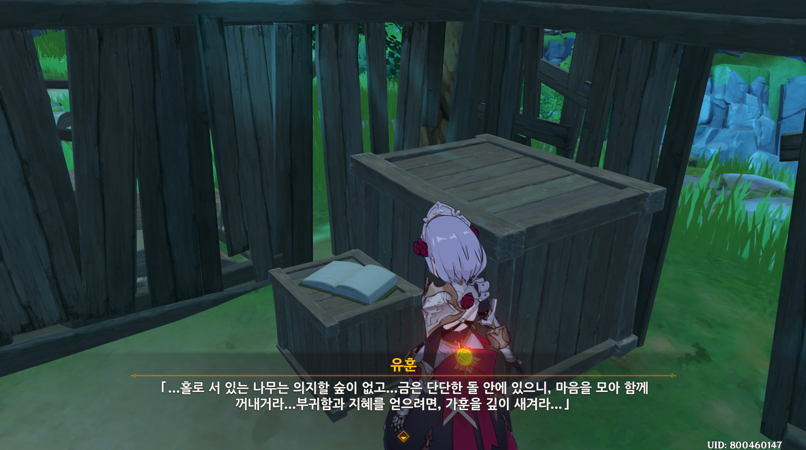 원신 홀로 서 있는 나무는 의지할 숲이 없고 가훈 찾기 갱도이니 입구는 언덕 아래 있습니다. 가훈을 다 찾고 나면 보물 찾기 임무를 줍니다. 가훈 찾기 임무에서 조사를 하면 유령들이 나와서 ��