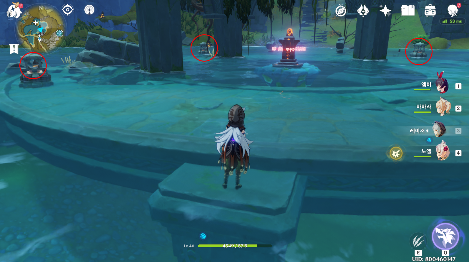 정령(?)이 나오면 캐릭터에 달라붙고, 그 상태로 돌기둥에 가면 자동으로 들어갑니다. 이런 방법으로 나머지 돌기둥들도 정령(?)을 집어넣어 주면 됩니다.