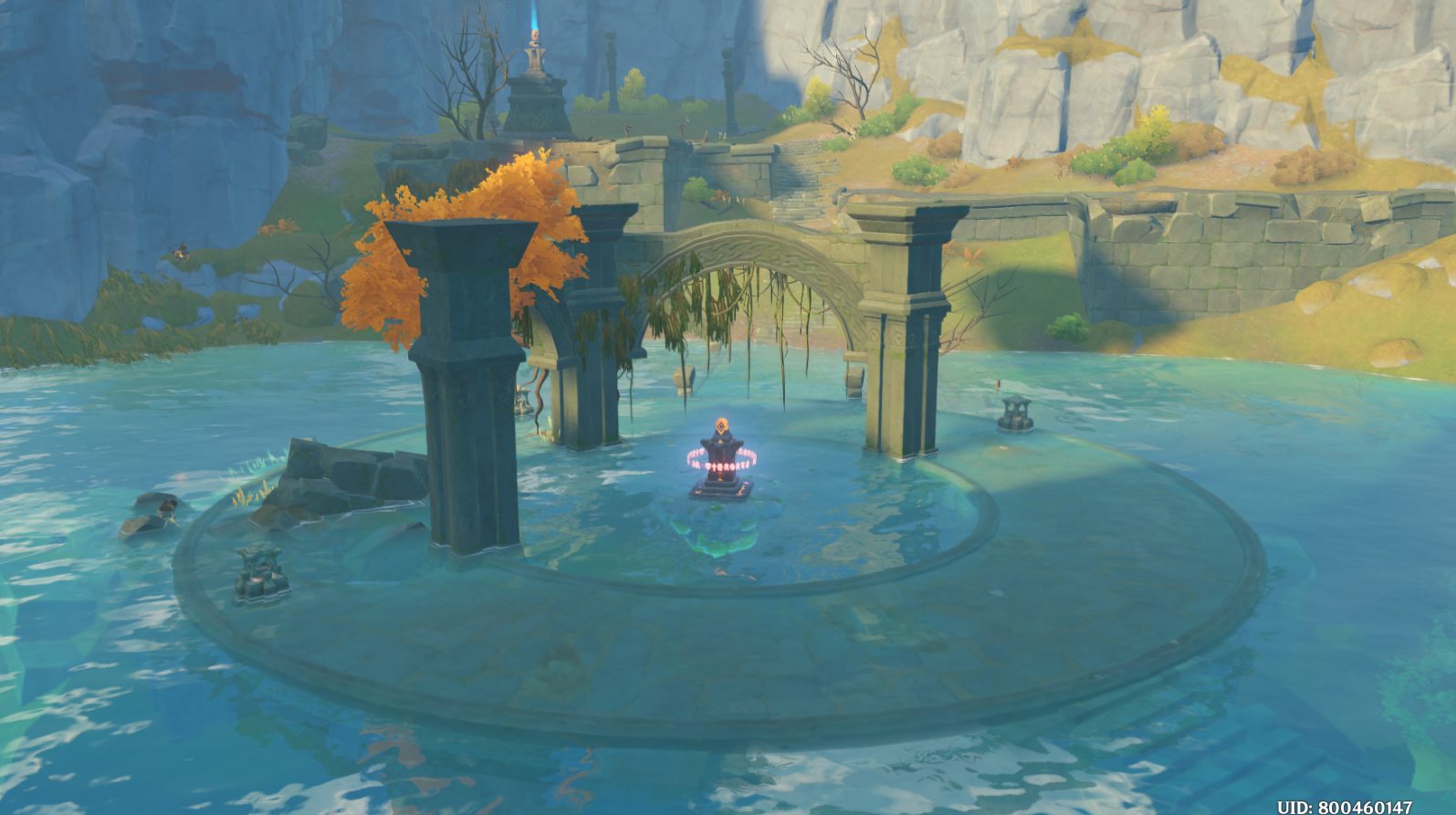 3개의 돌기둥에 다 집어넣었으면 장치에 봉인이 풀리고 장치를 작동시키면 물이 완전히 빠지고 태산부의 워프를 활성화시킬 수 있습니다.