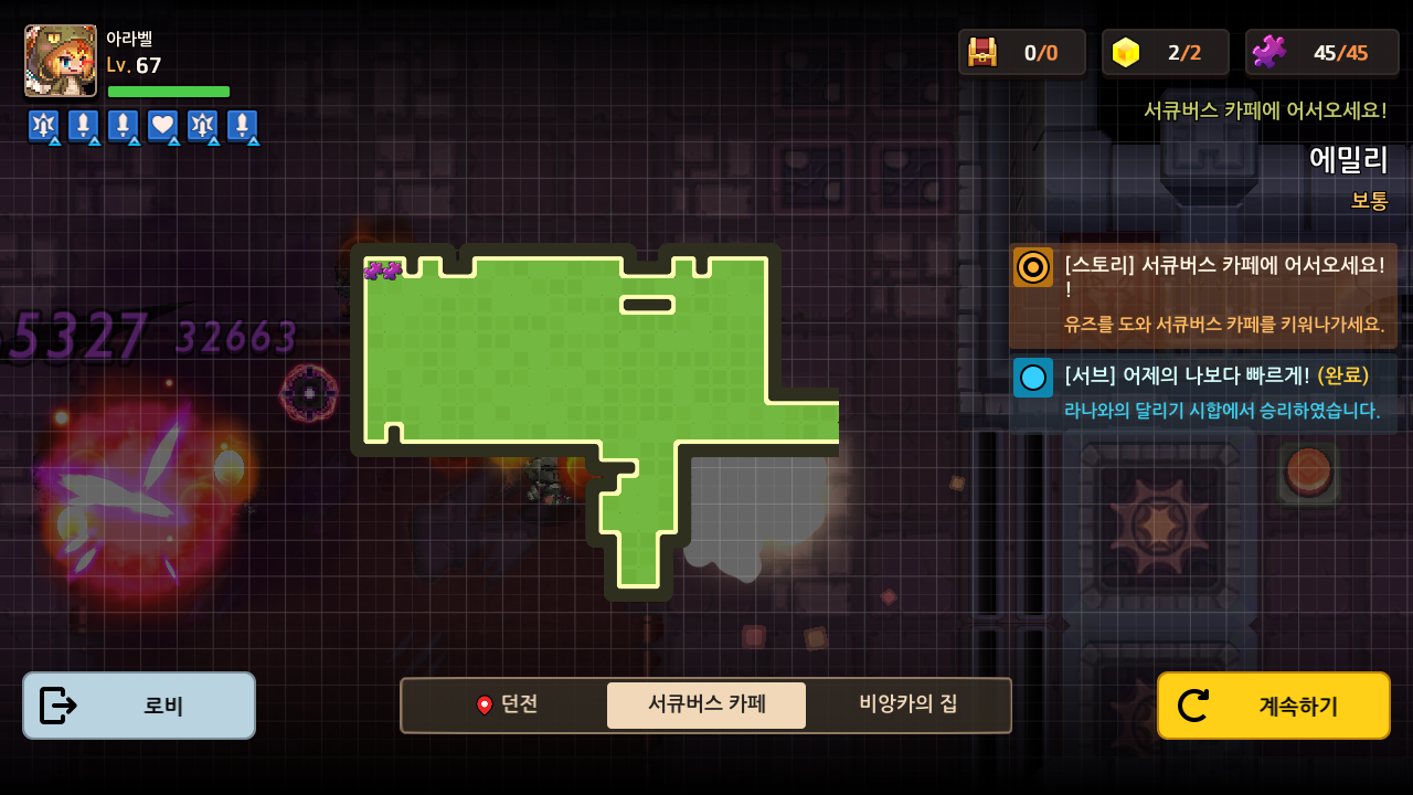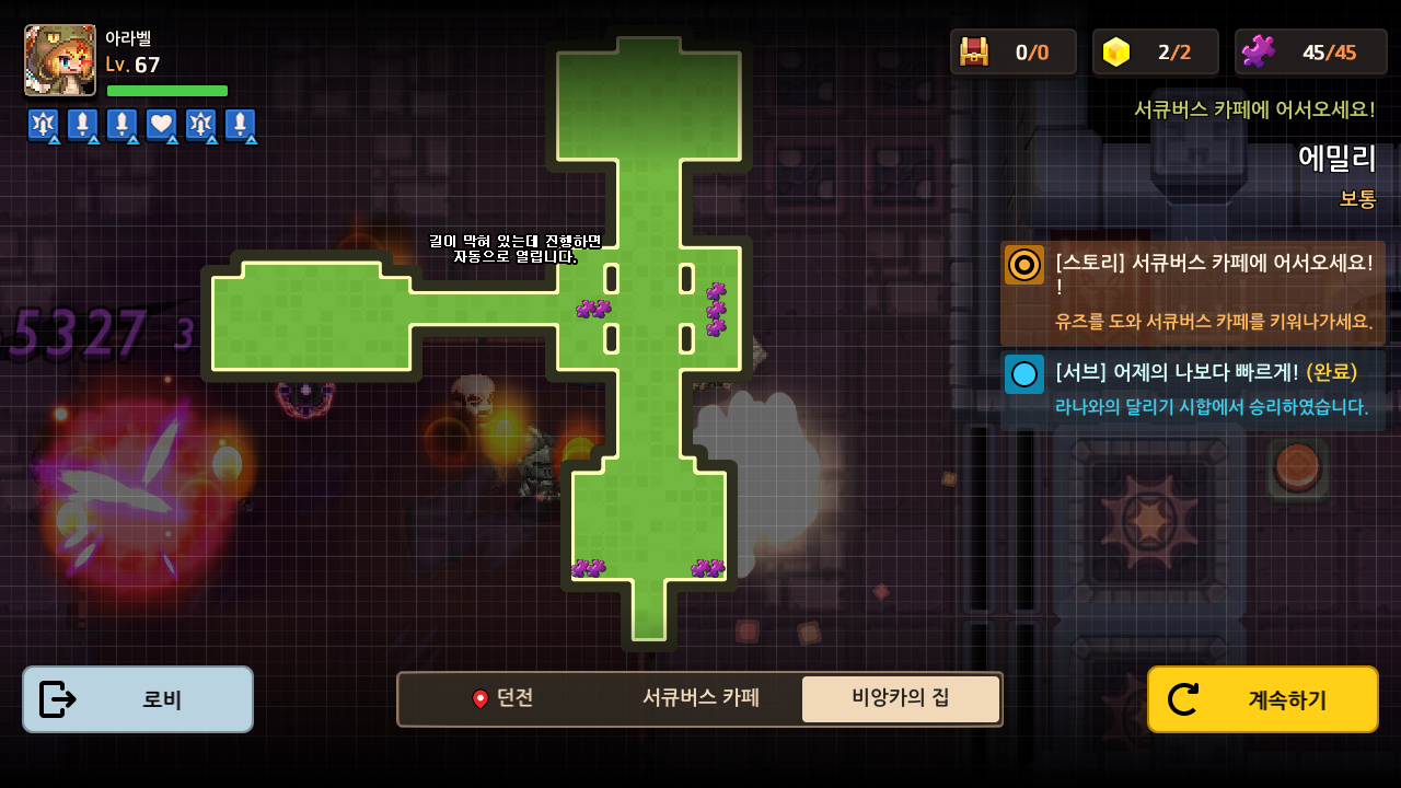 이번 스테이지는 달리기 시합이 좀 어렵습니다. 막힌 길이 비앙카의 집에 있는데, 메인 퀘스트를 진행하다 보면 열리고 메인 퀘스트에 있는 퀴즈 또한 어떤 답을 골라도 진행이 되는 거 같습니다. 마지막으로 서큐버스 카페를 운영하는데 별로 어렵지 않은 거 같습니다.