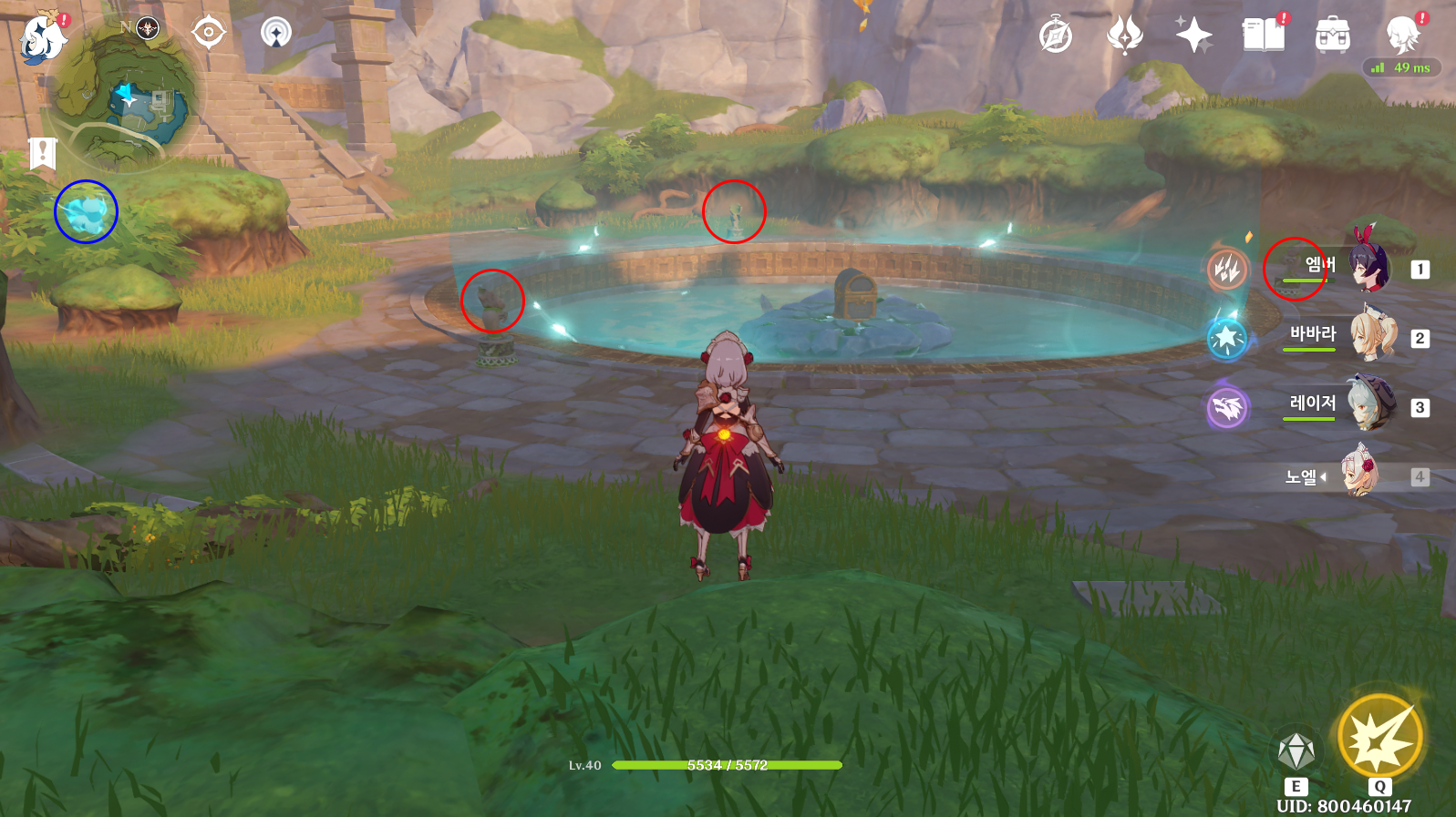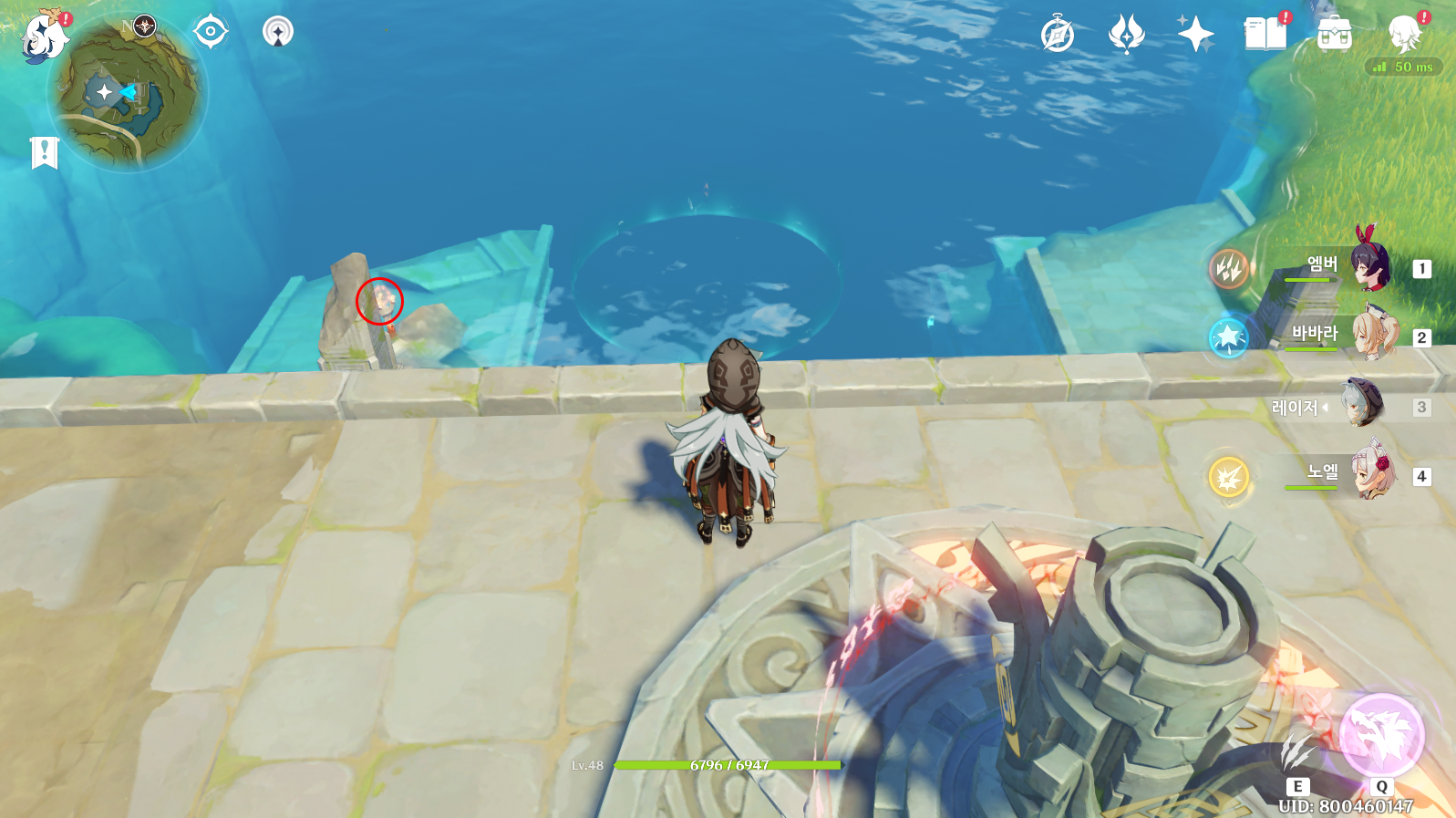 4개의 표시한 기둥 같은 거에 화염 원소 반응을 일으키면 토템의 봉인이 없어집니다. 그리고 토템에 바위 원소 반응을 일으키면 물이 다 빠져나갑니다.
