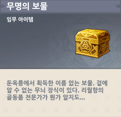원신 성법 관문 무명의 보물 월드 임무를 받을 수 있는 위치입니다. 지도에 표시한 위치에 가면 아래 사진과 같이 있고 아무거나 상호작용하면 월드 임무 성법에 있는 보물을 시작할 수 있습니��