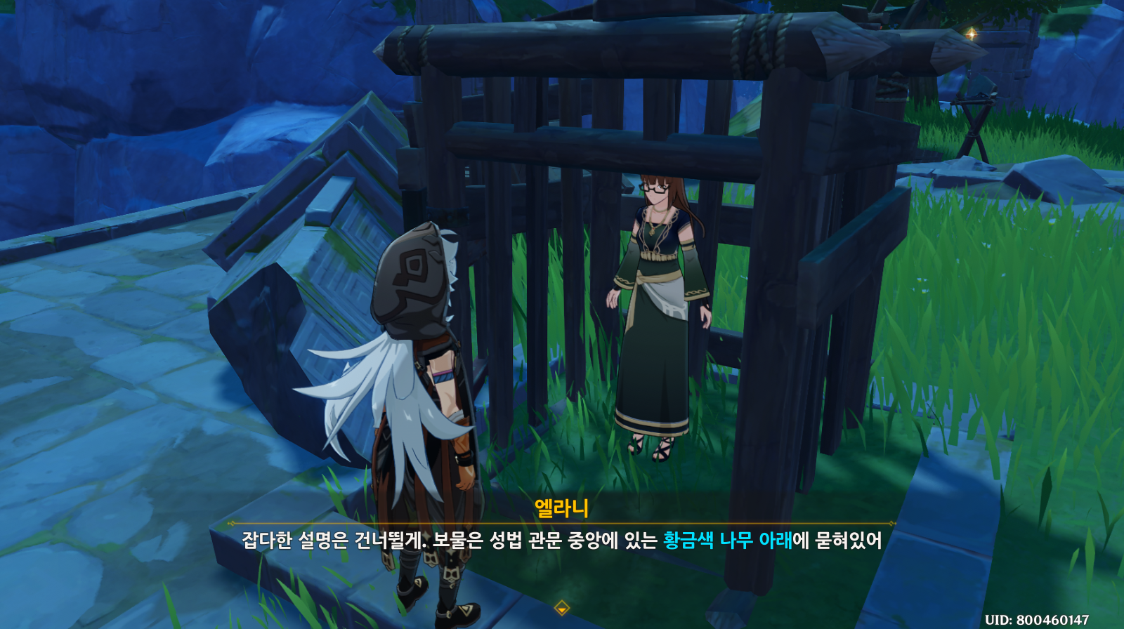실종된 학자 엘라니를 구하면 황금색 나무 아래 보물이 있다고 알려줍니다. 그리고 가까이 가면 발굴할 수 있는데 발굴하면 보물 상자가 등장합니다.