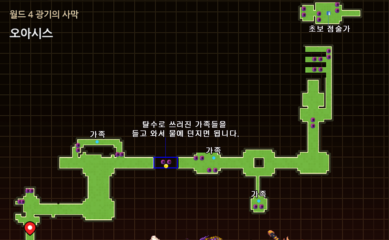 쓰러진 가족들을 들고 와서 오아시스에 던지면 탈수에서 구할 수 있습니다.