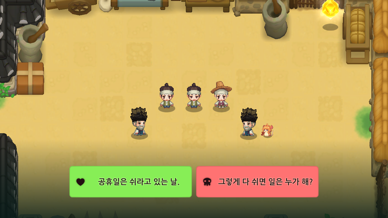 영감님 손톱은 쥐 상태로 말을 걸어야 이벤트가 발생합니다. 질문을 주는데 노비들이 좋아할 만한 답으로 고르면 됩니다.
