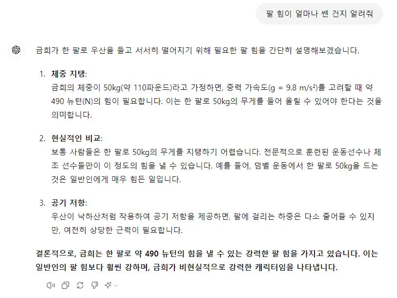 한 팔로 날고 있는데 힘이 얼마나 센 걸까 GPT에게 물어보았다.