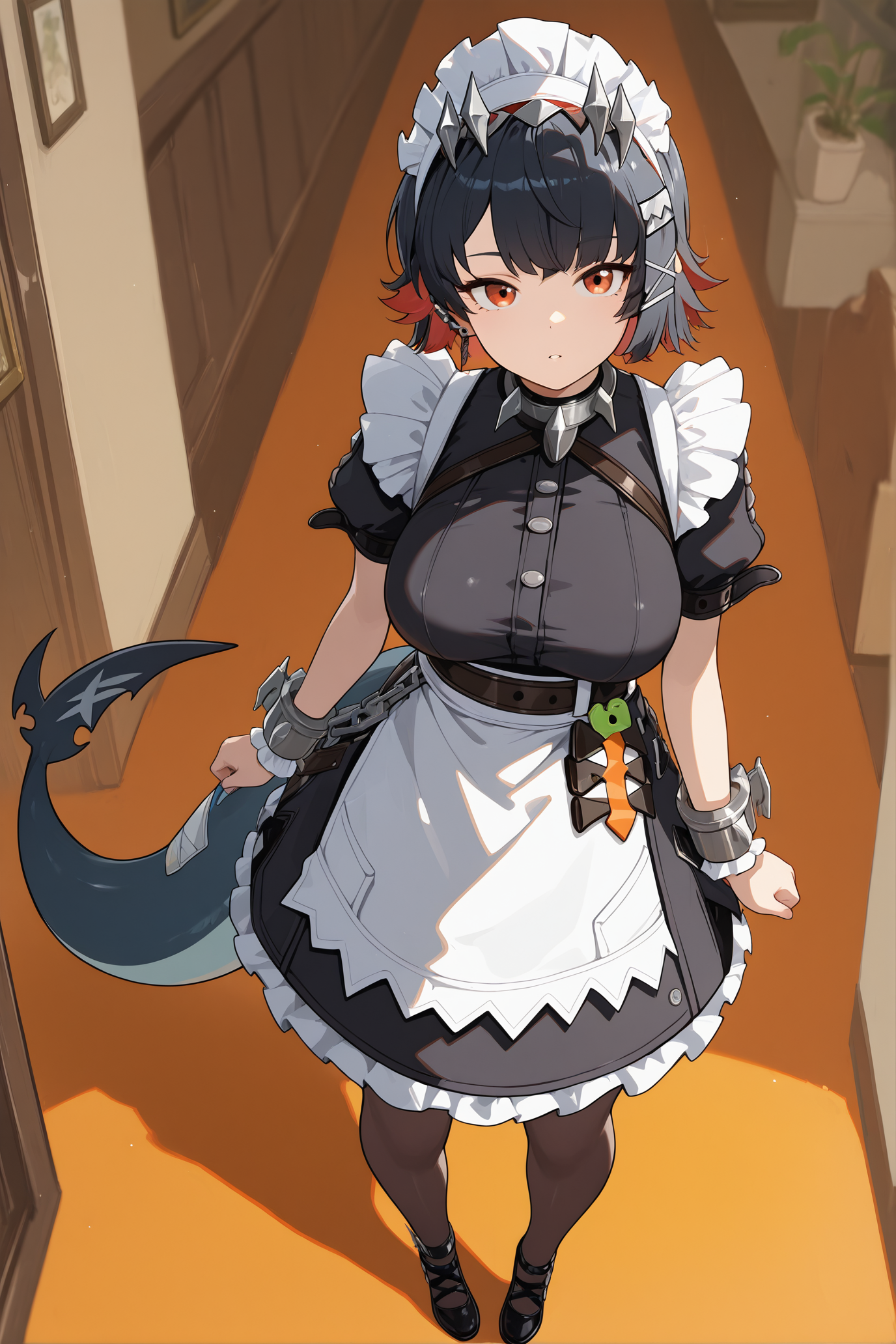 zenless zone zero breasts, short hair, bangs, multiple girls, large breasts, black hair, red eyes, dress, jewelry, sitting, tail, short sleeves, red hair, multicolored hair, earrings, frills, solo focus, indoors, black dress, cup, wrist cuffs, maid, maid headdress, piercing, ear piercing, maid apron,