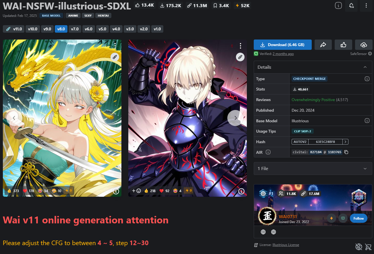 Resources used 부분에 WAI-NSFW-illustrious-SDXL을 클릭하면 다운로드 할 수 있는 페이지가 나오고 다운로드합니다.