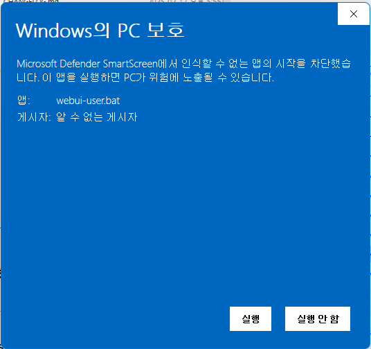 다운로드 파일을 보면 webui-user.bat이라는 파일이 있습니다. 해당 파일을 클릭해서 실행합니다. 아래와 같은 창이 나오는데 실행을 클릭합니다.