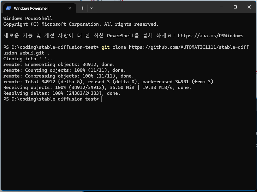 다시 실행할때도 똑같이 webui-user.bat 파일을 클릭하면 됩니다. 그리고 열린 웹사이트가 실행되었다고 위 터미널 창을 닫으면 웹사이트도 동작하지 않습니다. 따라서 사이트를 이용하는 동안에는 터미널을 닫으면 안됩니다.