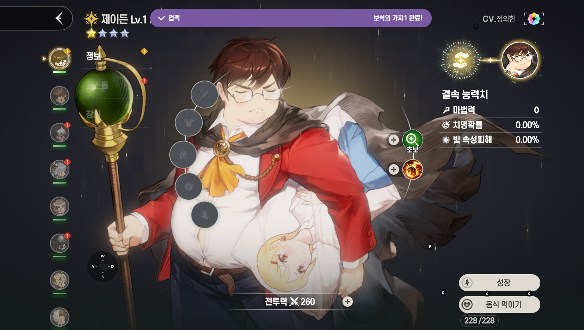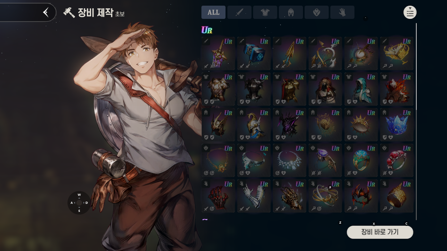 캐릭터를 클릭하면 아래 화면이 나오는데 제작할 수 있는 장비는 이미지에는 없어서 전부 어두운데 스크롤을 내리면 제작할 수 있는 장비는 없는 장비와 다르게 보임
