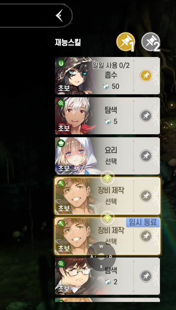 클릭을 하면 재능스킬이라는 탭에 캐릭터들이 나오는데 장비제작을 가지고 있는 캐릭터를 클릭한다.
