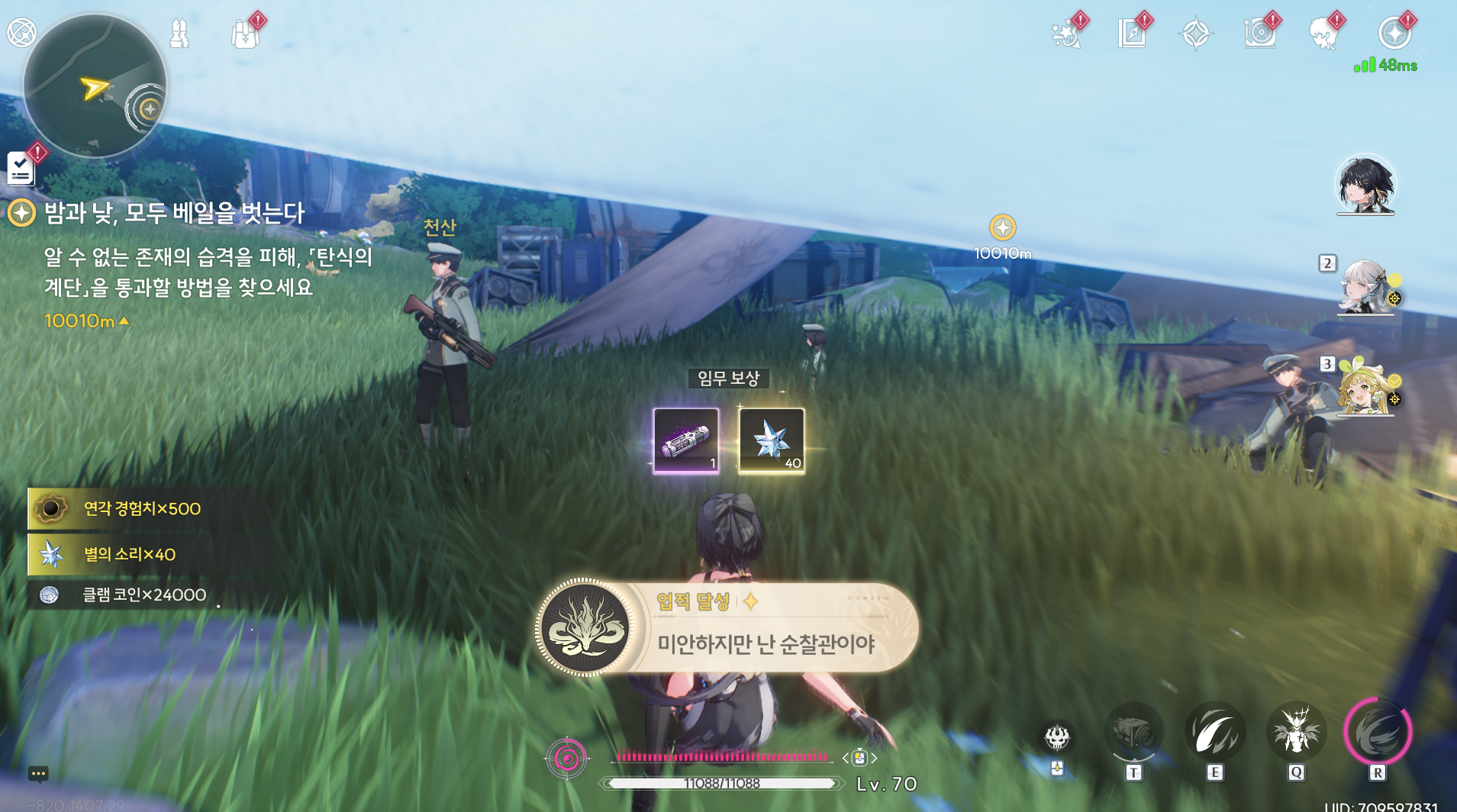 모두 줘팬다음에, 천산에게 정보를 전달하면 퀘스트가 완료됩니다.