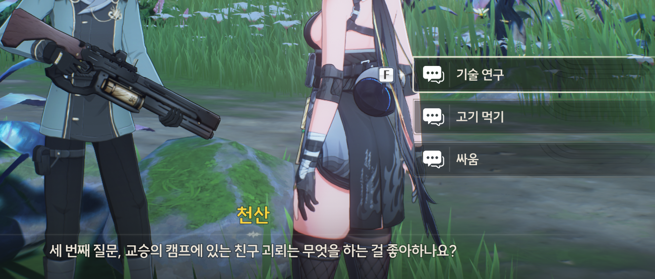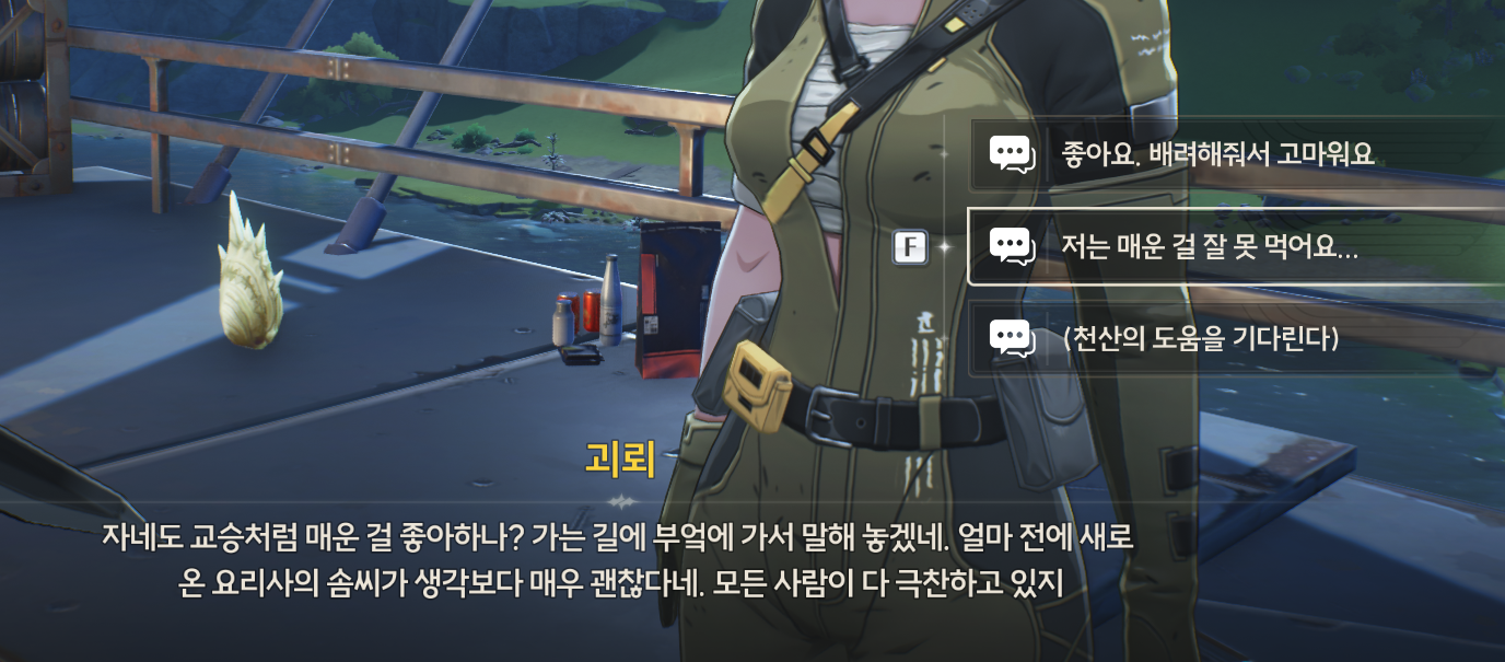 저는 천산의 도움을 기다린다. 선택했는데, 저희는 매운 걸 잘 못 먹어요... 이렇게 답하라고 합니다.
