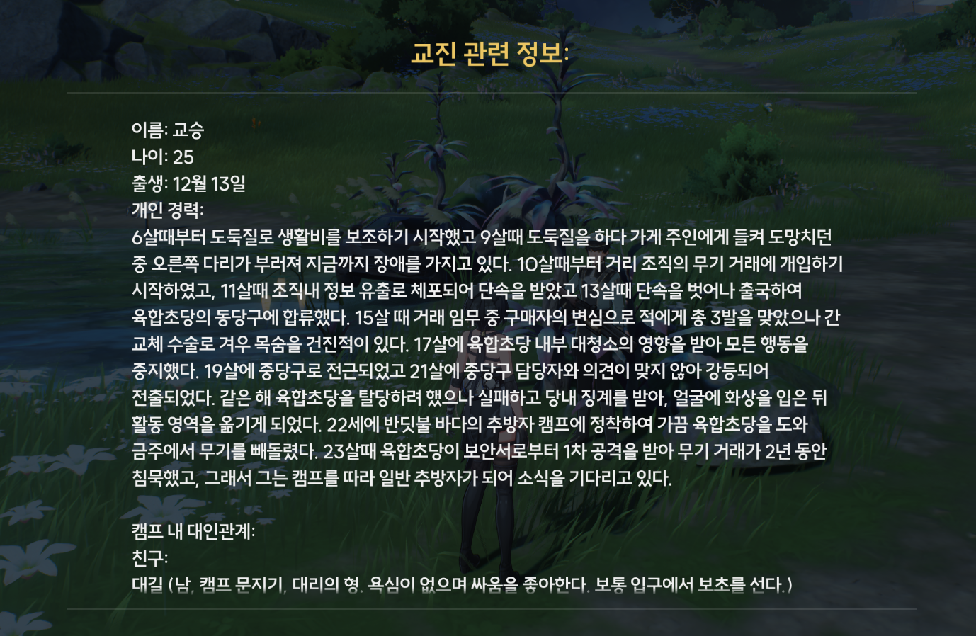 잠행하기 위해서 위장 신분 조사 자료를 외우라고 줍니다.