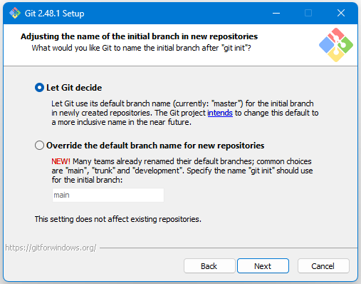 - 이 옵션을 선택하면 Git 설치 프로그램에 설정된 기본 이름을 그대로 사용하게 됩니다. (master)