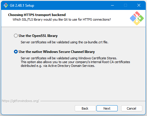 Git이 https://로 시작하는 주소와 통신할 때, 어떤 보안 기술(SSL/TLS 라이브러리)을 사용할지 선택하는 단계