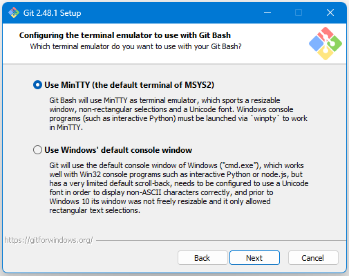 Git Bash를 실행할 때 어떤 종류의 명령줄 창(터미널 에뮬레이터)을 사용할지 선택하는 단계