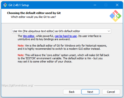 이 단계는 "앞으로 Git이 글자 입력이 필요할 때 어떤 프로그램을 쓸래?" 라고 묻는 것입니다.