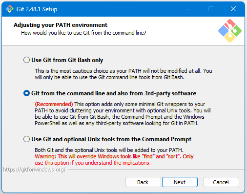 3. ◯ Use Git and optional Unix tools from the Command Prompt (명령 프롬프트에서 Git 및 Unix 도구 사용)