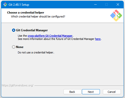 Git이 원격 저장소(GitHub 등)에 접속할 때 필요한 로그인 정보를 어떻게 저장하고 관리할지를 선택하는 단계