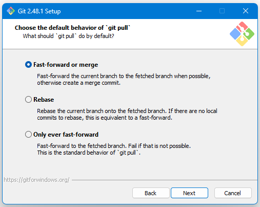 원격 저장소(예: GitHub)의 변경 사항을 내 컴퓨터로 가져와 합칠 때 사용하는 git pull 명령어의 기본 동작 방식을 선택