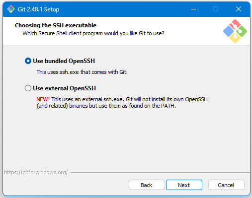 Git이 원격 서버(예: GitHub, GitLab)와 안전하게 통신할 때 사용할 SSH 클라이언트 프로그램을 선택하는 단계