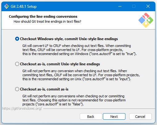 ◉ Checkout Windows-style, commit Unix-style line endings (Windows 스타일로 체크아웃, Unix 스타일로 커밋)