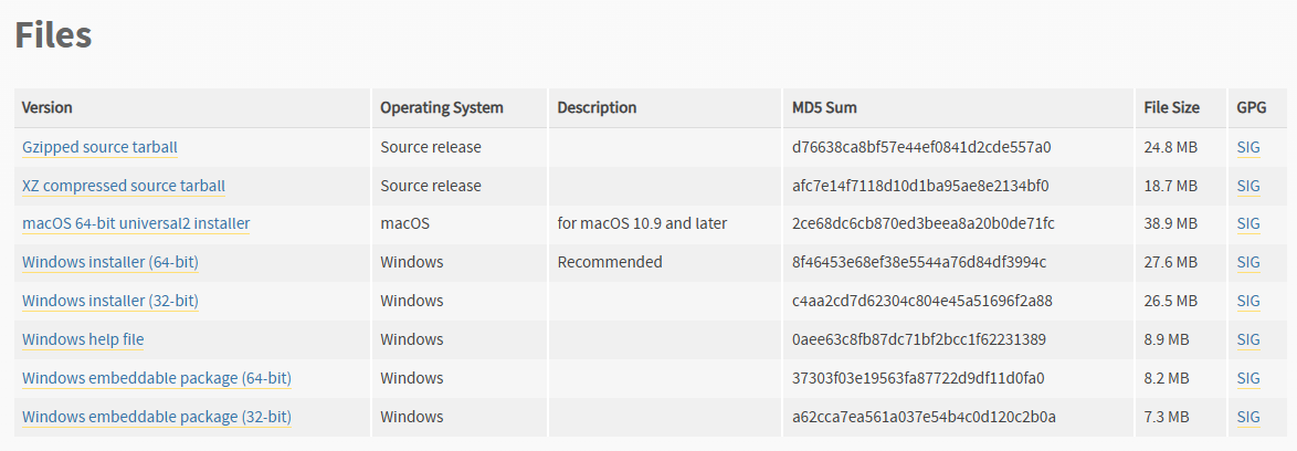 https://www.python.org/downloads/release/python-3106/ 페이지에 들어가서 아래로 내리면 이미지와 같은 부분이 보입니다. 자신의 컴퓨터 운영체제에 맞게 다운로드 받으면 됩니다. Description 부분을 보면 Recommended라 되어 있는 파일을 다운로드 받으면 될 거 같습니다.