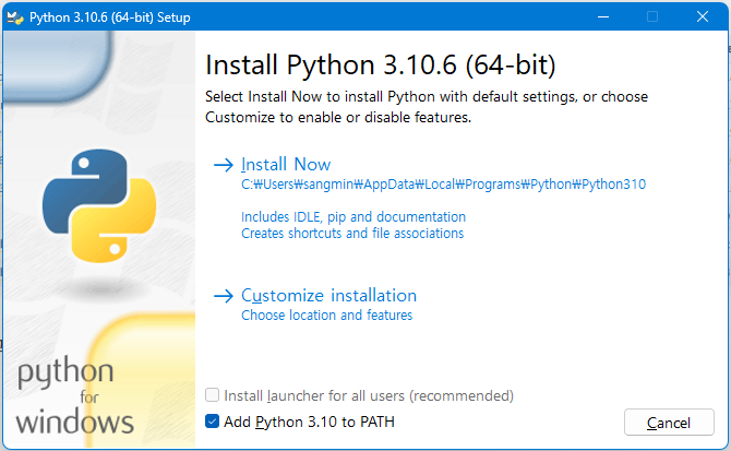 다운로드를 받고, 실행을 하면 Add Python 3.10 to PATH는 환경변수를 추가하는 옵션을 체크하고 Install Now를 클릭합니다.