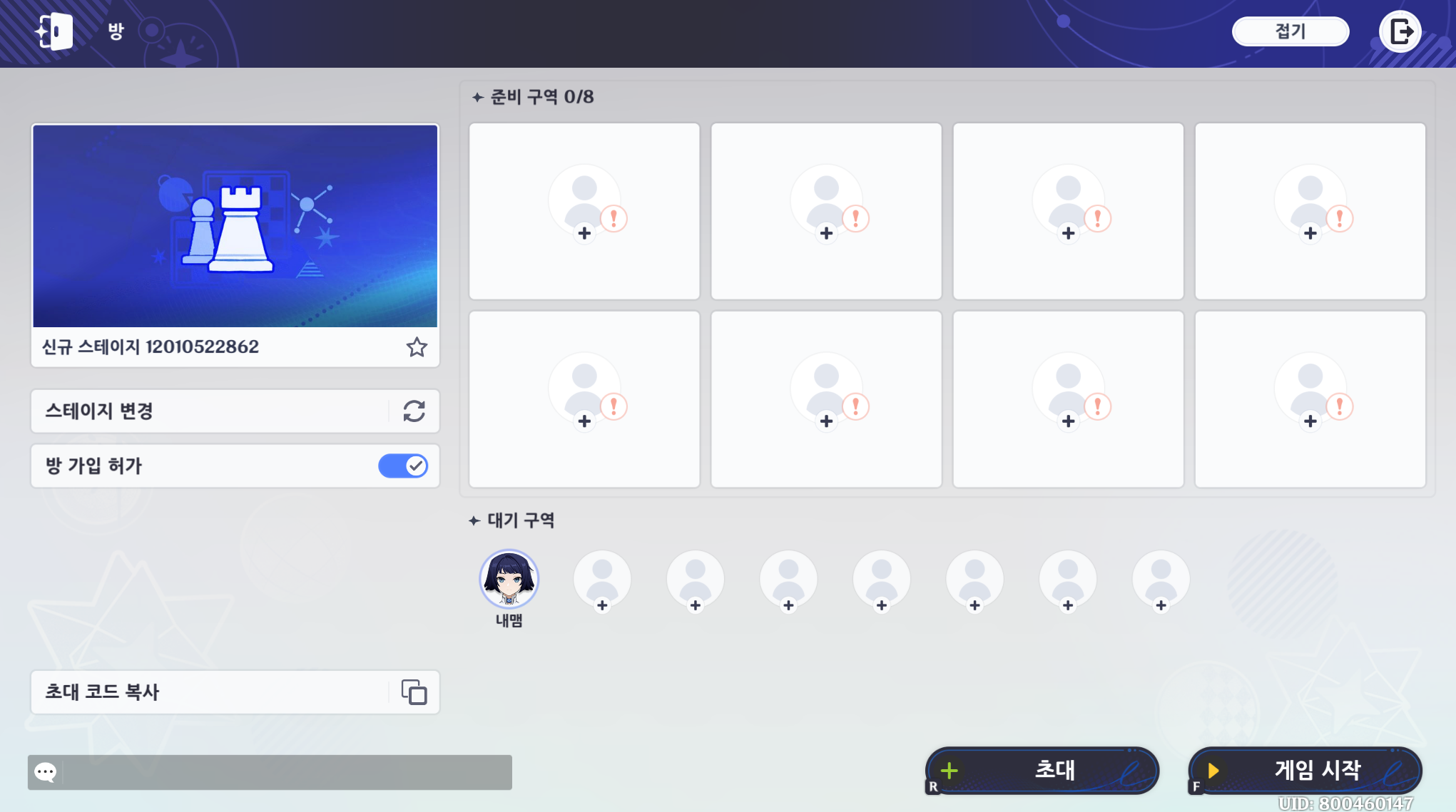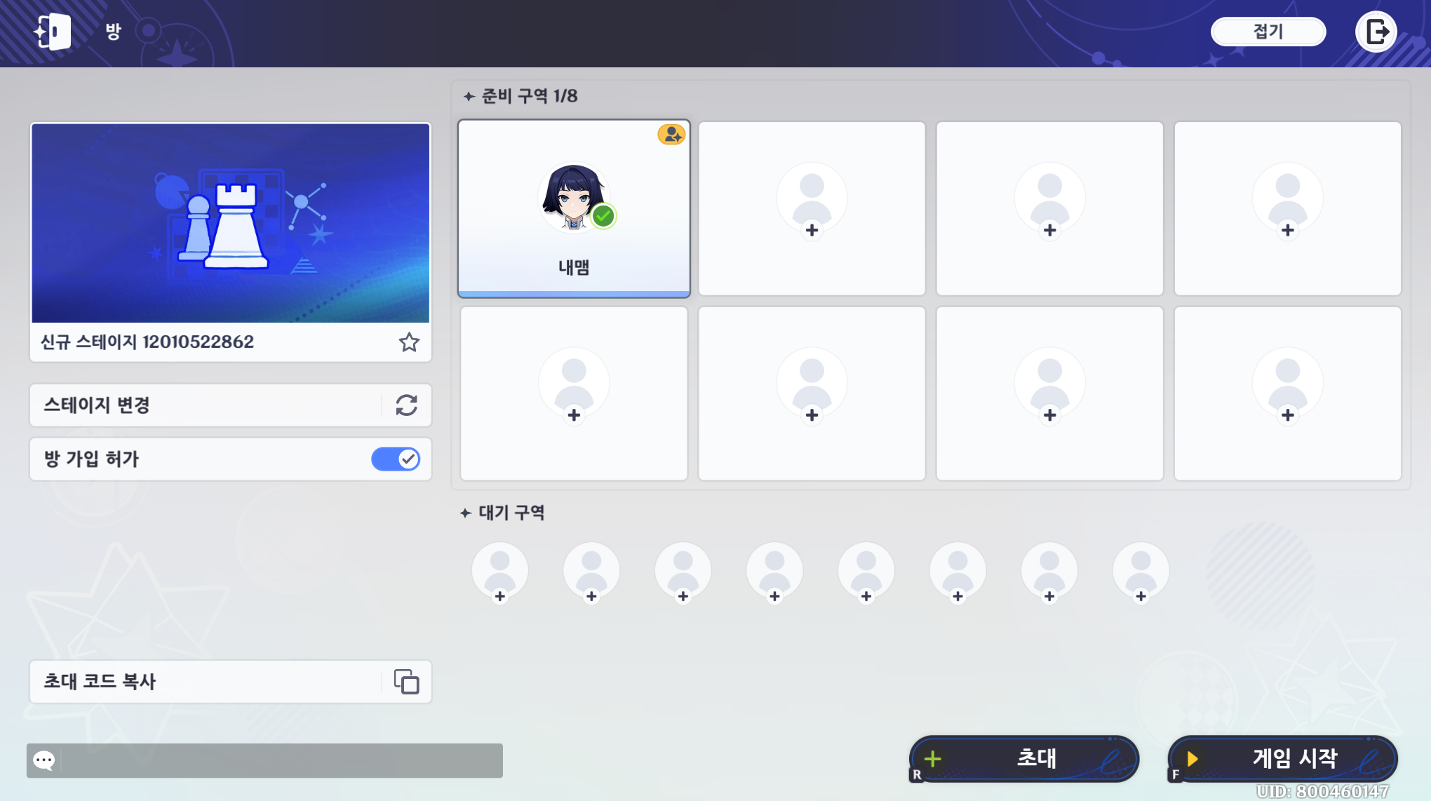 준비 구역에 캐릭터를 올려야 하는데, 준비 구역 + 버튼을 클릭하면 된다. 그런 다음 게임 시작 클릭