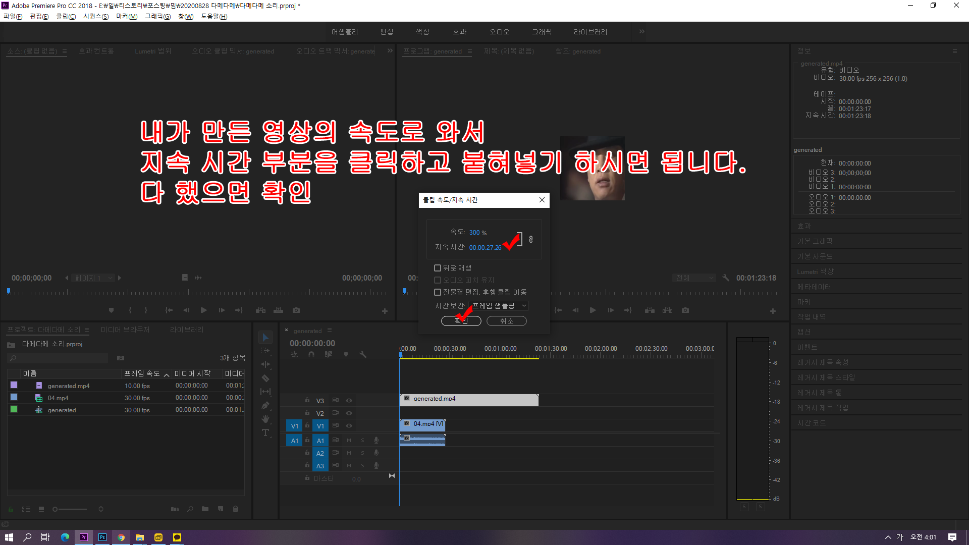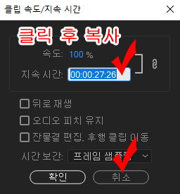 ↑내가 만든 영상의 시간을 수정해 줍니다.(이때 반드시 속도와 지속시간이 링크가 되어있어야 합니다. ) 수정했으면 확인 클릭