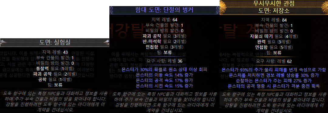 대강탈을 진행하기 위해서는 이발사 NPC 와카노(Whakano)에게 이전 강탈에서 받은 정보에 대한 증표를 지불해야 합니다. 정보는 강탈에서 훔친 유물을 제출할 때 자동으로 받게되는 것이며 대강탈 계획에 필수적인 요소입니다. 이 정보는 탈출 경로, 보상이 있는 방 등 다양한 정보를 공개할 수 있습니다. 원하는 만큼(또는, 여러분이 감당할 수 있는 만큼) 정보를 공개하면 도면을 도둑 항구에 있는 관리자 NPC 쿠라이(Kurai)가 여러분과 함께할 동료 NPC 선정에 도움을 주며, 도면에 대한 검토를 진행해 줍니다. 또한, 여러분이 원하면 도면을 다른 유저와 교환하거나 아디야(Adiyah)에게 가져가 대강탈을 시작할 수 있습니다.