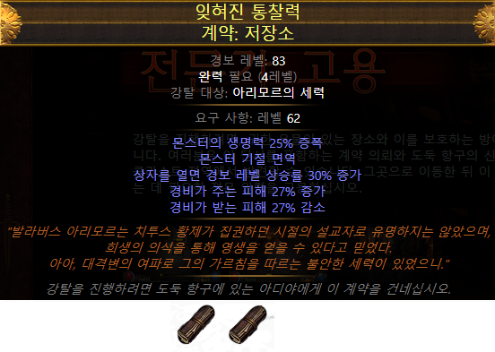 강탈을 시작하기 위해서 먼저 계약이 필요합니다. 계약은 몹들이 드롭하고, 강탈 완료 시에도 획득합니다. 또 이 계약은 커런시를 활용해 크래프팅 할 수 있습니다. 계약은 도둑 항구에 있는 길잡이 NPC 이디야를 통해서 진행할 수 있습니다.